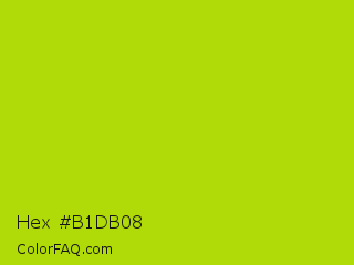 Hex #b1db08 Color is a normal lime color and the nearest color is Vivid Lime Green #a6d608. Hex code #b1db08 and RGB value is rgb(177,219,8). In RGB color space, this color is composed of 69% red, 86% green, 3% blue, In CMYK color space, this color is composed of 19% cyan, 0% magenta, 96% yellow , 14% black , In HSL color space, this color has a hue angle of 72° , 93% saturation and 45% lightness.