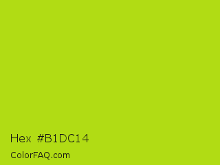 Hex #b1dc14 Color is a normal lime color and the nearest color is Inch Worm #b0e313. Hex code #b1dc14 and RGB value is rgb(177,220,20). In RGB color space, this color is composed of 69% red, 86% green, 8% blue, In CMYK color space, this color is composed of 20% cyan, 0% magenta, 91% yellow , 14% black , In HSL color space, this color has a hue angle of 73° , 83% saturation and 47% lightness.