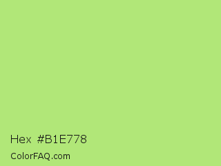 Hex #b1e778 Color is a light green color and the nearest color is Sulu #c1f07c. Hex code #b1e778 and RGB value is rgb(177,231,120). In RGB color space, this color is composed of 69% red, 91% green, 47% blue, In CMYK color space, this color is composed of 23% cyan, 0% magenta, 48% yellow , 9% black , In HSL color space, this color has a hue angle of 89° , 70% saturation and 69% lightness.
