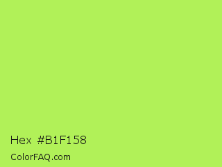 Hex #b1f158 Color is a light green color and the nearest color is Inchworm #b2ec5d. Hex code #b1f158 and RGB value is rgb(177,241,88). In RGB color space, this color is composed of 69% red, 95% green, 35% blue, In CMYK color space, this color is composed of 27% cyan, 0% magenta, 63% yellow , 5% black , In HSL color space, this color has a hue angle of 85° , 85% saturation and 65% lightness.