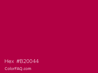 Hex #b20044 Color is a normal rose color and the nearest color is Shiraz #b20931. Hex code #b20044 and RGB value is rgb(178,0,68). In RGB color space, this color is composed of 70% red, 0% green, 27% blue, In CMYK color space, this color is composed of 0% cyan, 100% magenta, 62% yellow , 30% black , In HSL color space, this color has a hue angle of 337° , 100% saturation and 35% lightness.