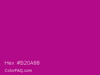 Hex #b20a88 Color is a normal magenta color and the nearest color is Red Violet #c71585. Hex code #b20a88 and RGB value is rgb(178,10,136). In RGB color space, this color is composed of 70% red, 4% green, 53% blue, In CMYK color space, this color is composed of 0% cyan, 94% magenta, 24% yellow , 30% black , In HSL color space, this color has a hue angle of 315° , 89% saturation and 37% lightness.