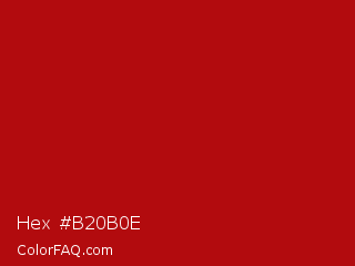 Hex #b20b0e Color is a normal red color and the nearest color is Milano Red #b81104. Hex code #b20b0e and RGB value is rgb(178,11,14). In RGB color space, this color is composed of 70% red, 4% green, 5% blue, In CMYK color space, this color is composed of 0% cyan, 94% magenta, 92% yellow , 30% black , In HSL color space, this color has a hue angle of 359° , 88% saturation and 37% lightness.