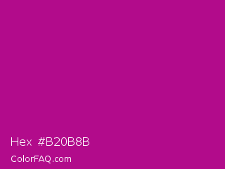 Hex #b20b8b Color is a normal magenta color and the nearest color is Red Violet #c71585. Hex code #b20b8b and RGB value is rgb(178,11,139). In RGB color space, this color is composed of 70% red, 4% green, 55% blue, In CMYK color space, this color is composed of 0% cyan, 94% magenta, 22% yellow , 30% black , In HSL color space, this color has a hue angle of 314° , 88% saturation and 37% lightness.