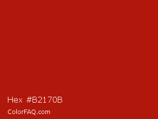 Hex #b2170b Color is a normal red color and the nearest color is International Orange Engineering #ba160c. Hex code #b2170b and RGB value is rgb(178,23,11). In RGB color space, this color is composed of 70% red, 9% green, 4% blue, In CMYK color space, this color is composed of 0% cyan, 87% magenta, 94% yellow , 30% black , In HSL color space, this color has a hue angle of 4° , 88% saturation and 37% lightness.