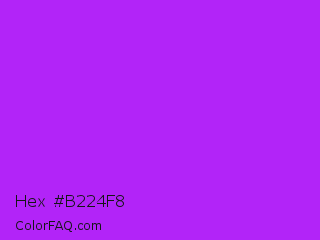 Hex #b224f8 Color is a normal purple color and the nearest color is Veronica #a020f0. Hex code #b224f8 and RGB value is rgb(178,36,248). In RGB color space, this color is composed of 70% red, 14% green, 97% blue, In CMYK color space, this color is composed of 28% cyan, 85% magenta, 0% yellow , 3% black , In HSL color space, this color has a hue angle of 280° , 94% saturation and 56% lightness.