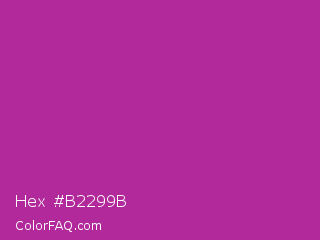 Hex #b2299b Color is a normal magenta color and the nearest color is Byzantine #bd33a4. Hex code #b2299b and RGB value is rgb(178,41,155). In RGB color space, this color is composed of 70% red, 16% green, 61% blue, In CMYK color space, this color is composed of 0% cyan, 77% magenta, 13% yellow , 30% black , In HSL color space, this color has a hue angle of 310° , 63% saturation and 43% lightness.