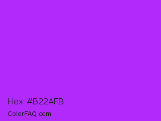 Hex #b22afb Color is a normal purple color and the nearest color is Veronica #a020f0. Hex code #b22afb and RGB value is rgb(178,42,251). In RGB color space, this color is composed of 70% red, 16% green, 98% blue, In CMYK color space, this color is composed of 29% cyan, 83% magenta, 0% yellow , 2% black , In HSL color space, this color has a hue angle of 279° , 96% saturation and 57% lightness.