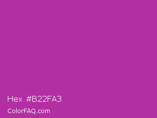 Hex #b22fa3 Color is a normal magenta color and the nearest color is Byzantine #bd33a4. Hex code #b22fa3 and RGB value is rgb(178,47,163). In RGB color space, this color is composed of 70% red, 18% green, 64% blue, In CMYK color space, this color is composed of 0% cyan, 74% magenta, 8% yellow , 30% black , In HSL color space, this color has a hue angle of 307° , 58% saturation and 44% lightness.