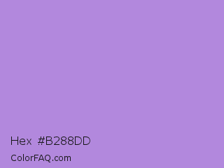 Hex #b288dd Color is a light violet color and the nearest color is Lavender #b57edc. Hex code #b288dd and RGB value is rgb(178,136,221). In RGB color space, this color is composed of 70% red, 53% green, 87% blue, In CMYK color space, this color is composed of 19% cyan, 38% magenta, 0% yellow , 13% black , In HSL color space, this color has a hue angle of 270° , 56% saturation and 70% lightness.