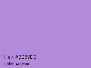 Hex #b289db Color is a light violet color and the nearest color is Lavender #b57edc. Hex code #b289db and RGB value is rgb(178,137,219). In RGB color space, this color is composed of 70% red, 54% green, 86% blue, In CMYK color space, this color is composed of 19% cyan, 37% magenta, 0% yellow , 14% black , In HSL color space, this color has a hue angle of 270° , 53% saturation and 70% lightness.
