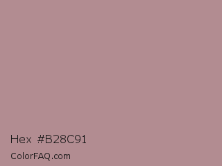 Hex #b28c91 Color is a light red color and the nearest color is English Lavender #b48395. Hex code #b28c91 and RGB value is rgb(178,140,145). In RGB color space, this color is composed of 70% red, 55% green, 57% blue, In CMYK color space, this color is composed of 0% cyan, 21% magenta, 19% yellow , 30% black , In HSL color space, this color has a hue angle of 352° , 20% saturation and 62% lightness.