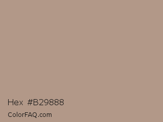 Hex #b29888 Color is a light orange color and the nearest color is Grullo #a99a86. Hex code #b29888 and RGB value is rgb(178,152,136). In RGB color space, this color is composed of 70% red, 60% green, 53% blue, In CMYK color space, this color is composed of 0% cyan, 15% magenta, 24% yellow , 30% black , In HSL color space, this color has a hue angle of 23° , 21% saturation and 62% lightness.