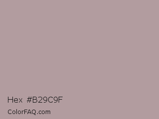 Hex #b29c9f Color is a light red color and the nearest color is Martini #afa09e. Hex code #b29c9f and RGB value is rgb(178,156,159). In RGB color space, this color is composed of 70% red, 61% green, 62% blue, In CMYK color space, this color is composed of 0% cyan, 12% magenta, 11% yellow , 30% black , In HSL color space, this color has a hue angle of 352° , 13% saturation and 65% lightness.