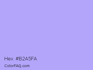 Hex #b2a5fa Color is a very light indigo color and the nearest color is Biloba Flower #b2a1ea. Hex code #b2a5fa and RGB value is rgb(178,165,250). In RGB color space, this color is composed of 70% red, 65% green, 98% blue, In CMYK color space, this color is composed of 29% cyan, 34% magenta, 0% yellow , 2% black , In HSL color space, this color has a hue angle of 249° , 89% saturation and 81% lightness.