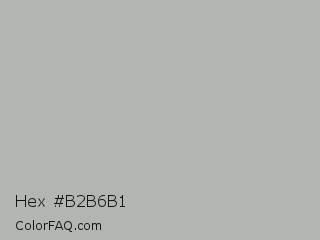 Hex #b2b6b1 Color is a light green color and the nearest color is Nobel #b7b1b1. Hex code #b2b6b1 and RGB value is rgb(178,182,177). In RGB color space, this color is composed of 70% red, 71% green, 69% blue, In CMYK color space, this color is composed of 2% cyan, 0% magenta, 3% yellow , 29% black , In HSL color space, this color has a hue angle of 108° , 3% saturation and 70% lightness.