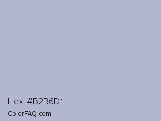 Hex #b2b6d1 Color is a light blue color and the nearest color is Casper #adbed1. Hex code #b2b6d1 and RGB value is rgb(178,182,209). In RGB color space, this color is composed of 70% red, 71% green, 82% blue, In CMYK color space, this color is composed of 15% cyan, 13% magenta, 0% yellow , 18% black , In HSL color space, this color has a hue angle of 232° , 25% saturation and 76% lightness.