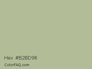 Hex #b2bd98 Color is a light lime color and the nearest color is Laurel Green #a9ba9d. Hex code #b2bd98 and RGB value is rgb(178,189,152). In RGB color space, this color is composed of 70% red, 74% green, 60% blue, In CMYK color space, this color is composed of 6% cyan, 0% magenta, 20% yellow , 26% black , In HSL color space, this color has a hue angle of 78° , 22% saturation and 67% lightness.
