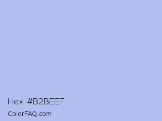 Hex #b2beef Color is a very light blue color and the nearest color is Perano #a9bef2. Hex code #b2beef and RGB value is rgb(178,190,239). In RGB color space, this color is composed of 70% red, 75% green, 94% blue, In CMYK color space, this color is composed of 26% cyan, 21% magenta, 0% yellow , 6% black , In HSL color space, this color has a hue angle of 228° , 66% saturation and 82% lightness.