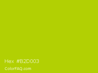 Hex #b2d003 Color is a normal yellow color and the nearest color is Rio Grande #bbd009. Hex code #b2d003 and RGB value is rgb(178,208,3). In RGB color space, this color is composed of 70% red, 82% green, 1% blue, In CMYK color space, this color is composed of 14% cyan, 0% magenta, 99% yellow , 18% black , In HSL color space, this color has a hue angle of 69° , 97% saturation and 41% lightness.