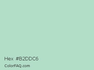 Hex #b2ddc6 Color is a light green color and the nearest color is Fringy Flower #b1e2c1. Hex code #b2ddc6 and RGB value is rgb(178,221,198). In RGB color space, this color is composed of 70% red, 87% green, 78% blue, In CMYK color space, this color is composed of 19% cyan, 0% magenta, 10% yellow , 13% black , In HSL color space, this color has a hue angle of 148° , 39% saturation and 78% lightness.
