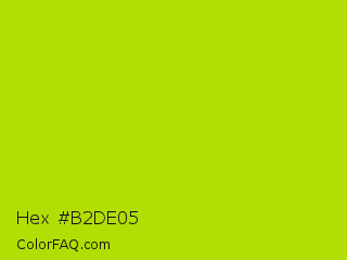 Hex #b2de05 Color is a normal lime color and the nearest color is Fuego #bede0d. Hex code #b2de05 and RGB value is rgb(178,222,5). In RGB color space, this color is composed of 70% red, 87% green, 2% blue, In CMYK color space, this color is composed of 20% cyan, 0% magenta, 98% yellow , 13% black , In HSL color space, this color has a hue angle of 72° , 96% saturation and 45% lightness.
