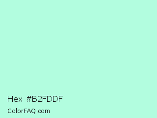 Hex #b2fddf Color is a very light green color and the nearest color is Ice Cold #b1f4e7. Hex code #b2fddf and RGB value is rgb(178,253,223). In RGB color space, this color is composed of 70% red, 99% green, 87% blue, In CMYK color space, this color is composed of 30% cyan, 0% magenta, 12% yellow , 1% black , In HSL color space, this color has a hue angle of 156° , 95% saturation and 85% lightness.