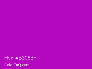 Hex #b308bf Color is a normal magenta color and the nearest color is Heliotrope Magenta #aa00bb. Hex code #b308bf and RGB value is rgb(179,8,191). In RGB color space, this color is composed of 70% red, 3% green, 75% blue, In CMYK color space, this color is composed of 6% cyan, 96% magenta, 0% yellow , 25% black , In HSL color space, this color has a hue angle of 296° , 92% saturation and 39% lightness.