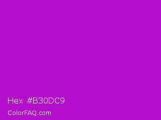 Hex #b30dc9 Color is a normal magenta color and the nearest color is Heliotrope Magenta #aa00bb. Hex code #b30dc9 and RGB value is rgb(179,13,201). In RGB color space, this color is composed of 70% red, 5% green, 79% blue, In CMYK color space, this color is composed of 11% cyan, 94% magenta, 0% yellow , 21% black , In HSL color space, this color has a hue angle of 293° , 88% saturation and 42% lightness.