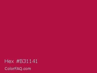 Hex #b31141 Color is a normal rose color and the nearest color is French Wine #ac1e44. Hex code #b31141 and RGB value is rgb(179,17,65). In RGB color space, this color is composed of 70% red, 7% green, 25% blue, In CMYK color space, this color is composed of 0% cyan, 91% magenta, 64% yellow , 30% black , In HSL color space, this color has a hue angle of 342° , 83% saturation and 38% lightness.