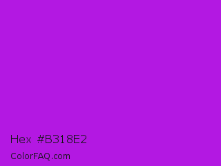 Hex #b318e2 Color is a normal purple color and the nearest color is Vivid Mulberry #b80ce3. Hex code #b318e2 and RGB value is rgb(179,24,226). In RGB color space, this color is composed of 70% red, 9% green, 89% blue, In CMYK color space, this color is composed of 21% cyan, 89% magenta, 0% yellow , 11% black , In HSL color space, this color has a hue angle of 286° , 81% saturation and 49% lightness.