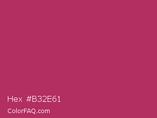 Hex #b32e61 Color is a normal rose color and the nearest color is Rich Maroon #b03060. Hex code #b32e61 and RGB value is rgb(179,46,97). In RGB color space, this color is composed of 70% red, 18% green, 38% blue, In CMYK color space, this color is composed of 0% cyan, 74% magenta, 46% yellow , 30% black , In HSL color space, this color has a hue angle of 337° , 59% saturation and 44% lightness.