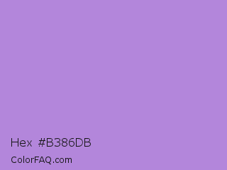 Hex #b386db Color is a light purple color and the nearest color is Lavender #b57edc. Hex code #b386db and RGB value is rgb(179,134,219). In RGB color space, this color is composed of 70% red, 53% green, 86% blue, In CMYK color space, this color is composed of 18% cyan, 39% magenta, 0% yellow , 14% black , In HSL color space, this color has a hue angle of 272° , 54% saturation and 69% lightness.
