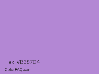 Hex #b387d4 Color is a light purple color and the nearest color is Lavender #b57edc. Hex code #b387d4 and RGB value is rgb(179,135,212). In RGB color space, this color is composed of 70% red, 53% green, 83% blue, In CMYK color space, this color is composed of 16% cyan, 36% magenta, 0% yellow , 17% black , In HSL color space, this color has a hue angle of 274° , 47% saturation and 68% lightness.