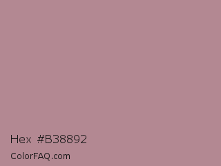 Hex #b38892 Color is a light red color and the nearest color is English Lavender #b48395. Hex code #b38892 and RGB value is rgb(179,136,146). In RGB color space, this color is composed of 70% red, 53% green, 57% blue, In CMYK color space, this color is composed of 0% cyan, 24% magenta, 18% yellow , 30% black , In HSL color space, this color has a hue angle of 346° , 22% saturation and 62% lightness.