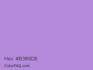 Hex #b389db Color is a light purple color and the nearest color is Lavender #b57edc. Hex code #b389db and RGB value is rgb(179,137,219). In RGB color space, this color is composed of 70% red, 54% green, 86% blue, In CMYK color space, this color is composed of 18% cyan, 37% magenta, 0% yellow , 14% black , In HSL color space, this color has a hue angle of 271° , 53% saturation and 70% lightness.