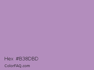 Hex #b38dbd Color is a light purple color and the nearest color is African Violet #b284be. Hex code #b38dbd and RGB value is rgb(179,141,189). In RGB color space, this color is composed of 70% red, 55% green, 74% blue, In CMYK color space, this color is composed of 5% cyan, 25% magenta, 0% yellow , 26% black , In HSL color space, this color has a hue angle of 288° , 27% saturation and 65% lightness.