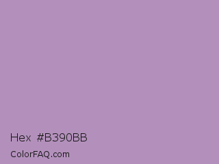 Hex #b390bb Color is a light purple color and the nearest color is Glossy Grape #ab92b3. Hex code #b390bb and RGB value is rgb(179,144,187). In RGB color space, this color is composed of 70% red, 56% green, 73% blue, In CMYK color space, this color is composed of 4% cyan, 23% magenta, 0% yellow , 27% black , In HSL color space, this color has a hue angle of 289° , 24% saturation and 65% lightness.