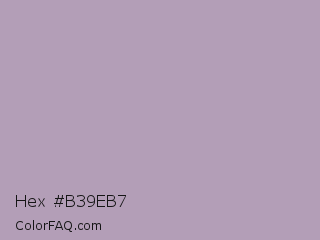 Hex #b39eb7 Color is a light purple color and the nearest color is Pastel Purple #b39eb5. Hex code #b39eb7 and RGB value is rgb(179,158,183). In RGB color space, this color is composed of 70% red, 62% green, 72% blue, In CMYK color space, this color is composed of 2% cyan, 14% magenta, 0% yellow , 28% black , In HSL color space, this color has a hue angle of 290° , 15% saturation and 67% lightness.