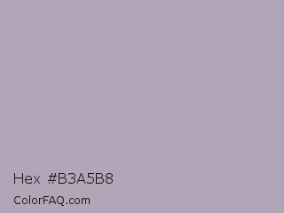 Hex #b3a5b8 Color is a light purple color and the nearest color is Pastel Purple #b39eb5. Hex code #b3a5b8 and RGB value is rgb(179,165,184). In RGB color space, this color is composed of 70% red, 65% green, 72% blue, In CMYK color space, this color is composed of 3% cyan, 10% magenta, 0% yellow , 28% black , In HSL color space, this color has a hue angle of 284° , 12% saturation and 68% lightness.