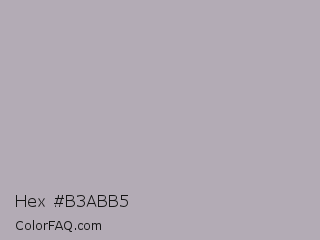 Hex #b3abb5 Color is a light purple color and the nearest color is Bombay #afb1b8. Hex code #b3abb5 and RGB value is rgb(179,171,181). In RGB color space, this color is composed of 70% red, 67% green, 71% blue, In CMYK color space, this color is composed of 1% cyan, 6% magenta, 0% yellow , 29% black , In HSL color space, this color has a hue angle of 288° , 6% saturation and 69% lightness.