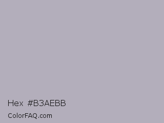 Hex #b3aebb Color is a light violet color and the nearest color is Bombay #afb1b8. Hex code #b3aebb and RGB value is rgb(179,174,187). In RGB color space, this color is composed of 70% red, 68% green, 73% blue, In CMYK color space, this color is composed of 4% cyan, 7% magenta, 0% yellow , 27% black , In HSL color space, this color has a hue angle of 263° , 9% saturation and 71% lightness.