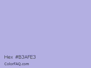 Hex #b3afe3 Color is a light indigo color and the nearest color is Maximum Blue Purple #acace6. Hex code #b3afe3 and RGB value is rgb(179,175,227). In RGB color space, this color is composed of 70% red, 69% green, 89% blue, In CMYK color space, this color is composed of 21% cyan, 23% magenta, 0% yellow , 11% black , In HSL color space, this color has a hue angle of 245° , 48% saturation and 79% lightness.