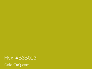 Hex #b3b013 Color is a normal yellow color and the nearest color is Sahara #b7a214. Hex code #b3b013 and RGB value is rgb(179,176,19). In RGB color space, this color is composed of 70% red, 69% green, 7% blue, In CMYK color space, this color is composed of 0% cyan, 2% magenta, 89% yellow , 30% black , In HSL color space, this color has a hue angle of 59° , 81% saturation and 39% lightness.