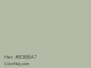 Hex #b3bba7 Color is a light green color and the nearest color is Eagle #b6baa4. Hex code #b3bba7 and RGB value is rgb(179,187,167). In RGB color space, this color is composed of 70% red, 73% green, 65% blue, In CMYK color space, this color is composed of 4% cyan, 0% magenta, 11% yellow , 27% black , In HSL color space, this color has a hue angle of 84° , 13% saturation and 69% lightness.