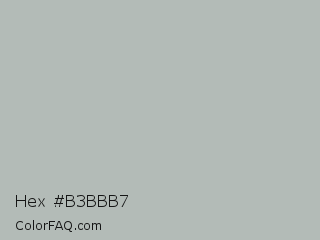 Hex #b3bbb7 Color is a light green color and the nearest color is Ash Gray #b2beb5. Hex code #b3bbb7 and RGB value is rgb(179,187,183). In RGB color space, this color is composed of 70% red, 73% green, 72% blue, In CMYK color space, this color is composed of 4% cyan, 0% magenta, 2% yellow , 27% black , In HSL color space, this color has a hue angle of 150° , 6% saturation and 72% lightness.