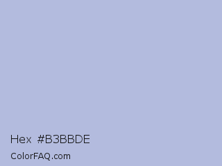 Hex #b3bbde Color is a light blue color and the nearest color is Pigeon Post #afbdd9. Hex code #b3bbde and RGB value is rgb(179,187,222). In RGB color space, this color is composed of 70% red, 73% green, 87% blue, In CMYK color space, this color is composed of 19% cyan, 16% magenta, 0% yellow , 13% black , In HSL color space, this color has a hue angle of 229° , 39% saturation and 79% lightness.