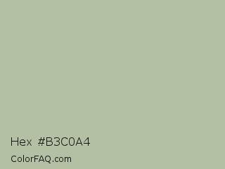Hex #b3c0a4 Color is a light green color and the nearest color is Eagle #b6baa4. Hex code #b3c0a4 and RGB value is rgb(179,192,164). In RGB color space, this color is composed of 70% red, 75% green, 64% blue, In CMYK color space, this color is composed of 7% cyan, 0% magenta, 15% yellow , 25% black , In HSL color space, this color has a hue angle of 88° , 18% saturation and 70% lightness.