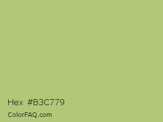 Hex #b3c779 Color is a light lime color and the nearest color is Wild Willow #b9c46a. Hex code #b3c779 and RGB value is rgb(179,199,121). In RGB color space, this color is composed of 70% red, 78% green, 47% blue, In CMYK color space, this color is composed of 10% cyan, 0% magenta, 39% yellow , 22% black , In HSL color space, this color has a hue angle of 75° , 41% saturation and 63% lightness.