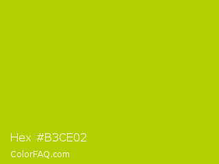 Hex #b3ce02 Color is a normal yellow color and the nearest color is Rio Grande #bbd009. Hex code #b3ce02 and RGB value is rgb(179,206,2). In RGB color space, this color is composed of 70% red, 81% green, 1% blue, In CMYK color space, this color is composed of 13% cyan, 0% magenta, 99% yellow , 19% black , In HSL color space, this color has a hue angle of 68° , 98% saturation and 41% lightness.